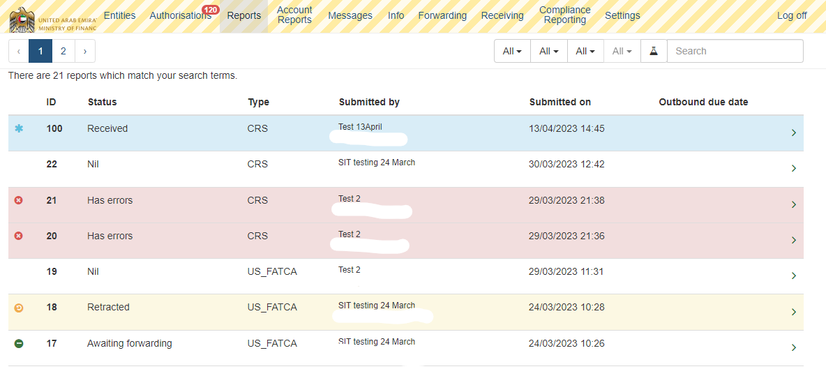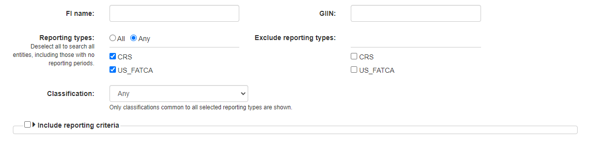 The Entities menu option allows the user to search for names and GIINs and also FIs that meet a certain criteria.